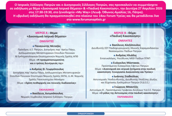 ΑνακοινώσειςΕνημέρωσηΗμερίδες-Εκδηλώσεις 14ο Forum Υγείας: Δικονομικά – Ιατρικά θέματα