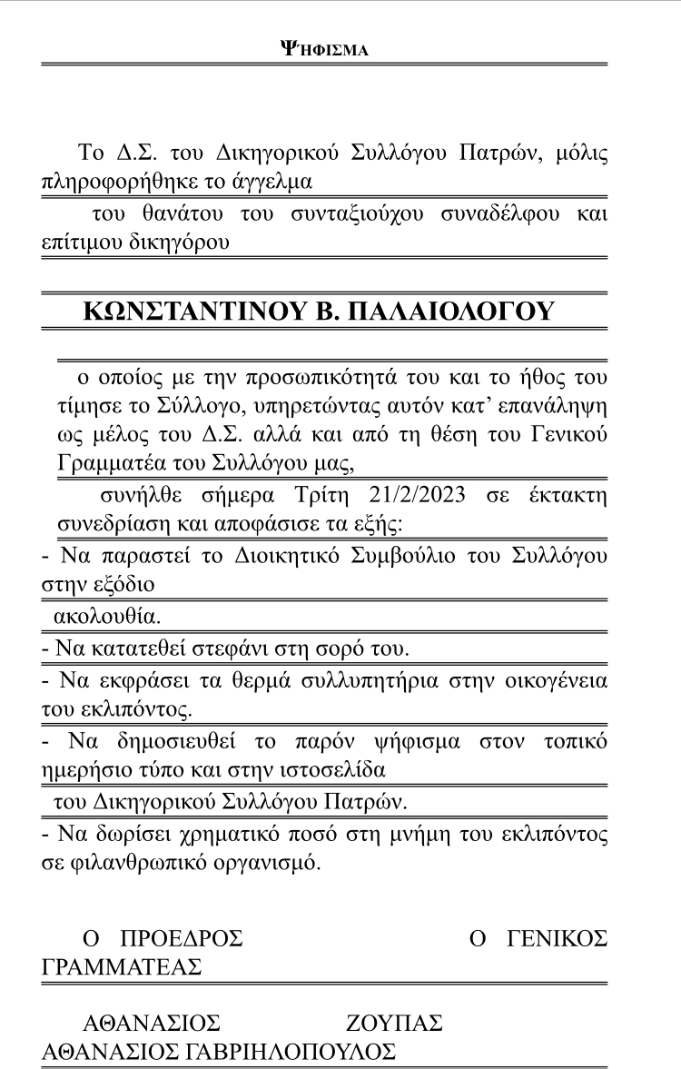 Ψήφισμα για το θάνατο του συνταξιούχου δικηγόρου Κων/νου Παλαιολόγου